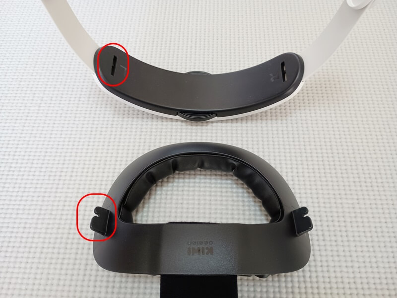 まずは、ストラップの骨組みと、後頭部クッションを合体。画像赤枠の部分を合わせるのですが、これは非対称になっているので左右間違うことはないはず。