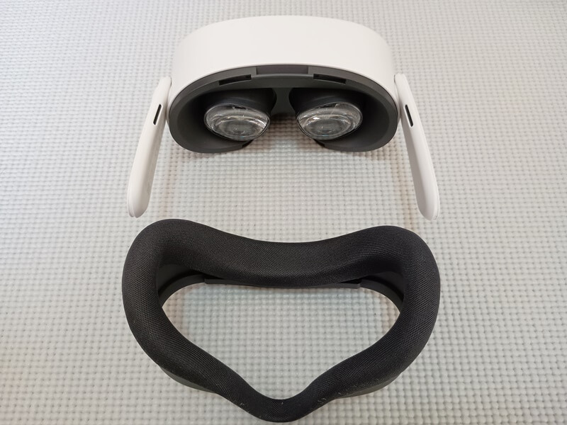 Meta Quest 3S本体の方は初期ストラップと接眼部を外しておきます。個人的にストラップを外すとき、アームが折れそうでけっこう怖いです。