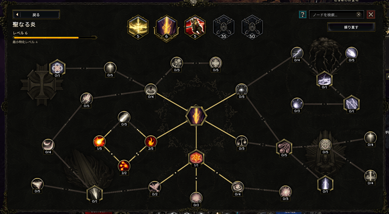 PoEで見たことがあるような、Igniteの伝搬や、Ignite状態の敵が死亡時に爆発するパッシブスキルが有用そうなので、それらを優先して取得しました。