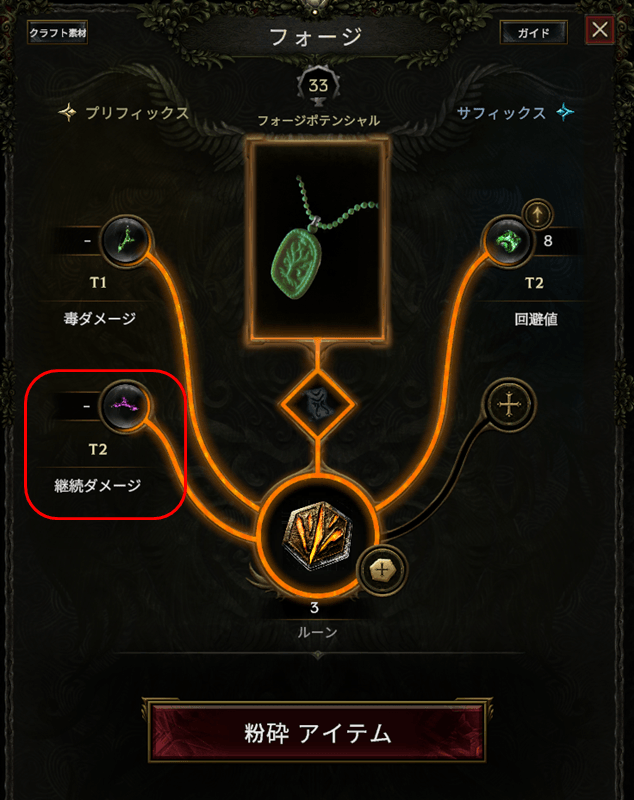 今回のビルドでは火ダメージや継続ダメージといったModを盛ればDPSが増えていきます。お目当てのModがついているアイテムが落ちたらRune of Shatteringを使ってシャードをちびちび取り出したりしていました。有用なModが複数ついたアイテムを、ポテンシャルが許す限りシャードで強化していく感じ。