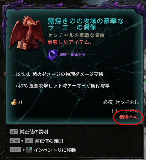 するとまさかに「装備不可」状態に。おそらくこれが一番のハズレなんでしょうね。有用なModがシンプルに追加される場合もあったので、かなりギャンブル要素が大きいクラフトな印象です。