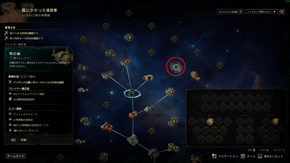 ポイントの獲得方法は主に、織られしエコーという、PoEでいうユニークマップを手に入れて、そのクリアボーナスを得るという形。中には最低腐敗度が決まっているものもあるので、最初から全部埋めることは出来ない。