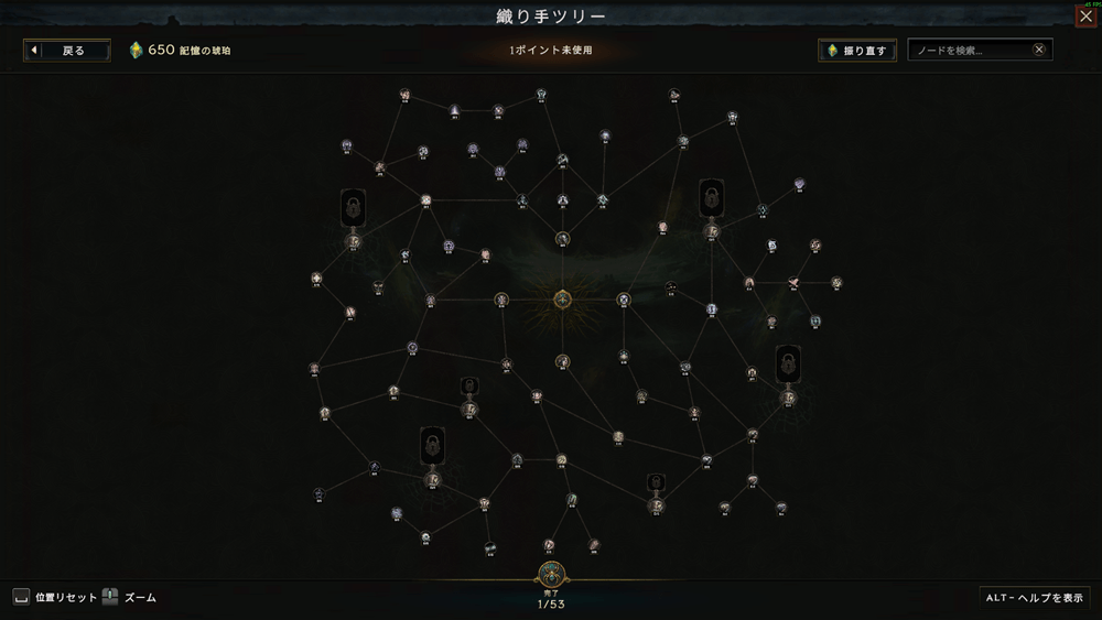 Weaver(織られし者)の織られしツリー。PoEでいうアトラスパッシブツリー。PoEの場合と同じく、これにポイントを振っているかどうかでエコーの旨味が大きく変わります。急がなくてもいいけど、なるべく早めに埋めていきたい。