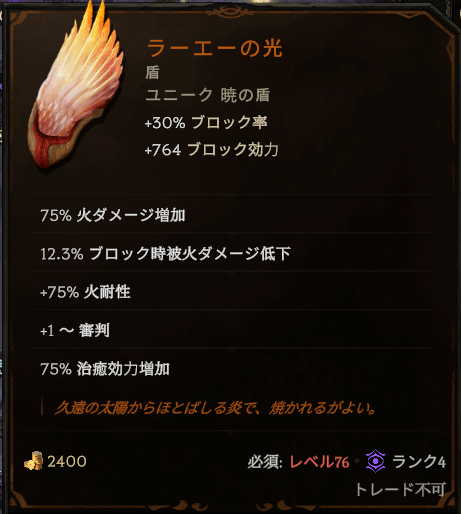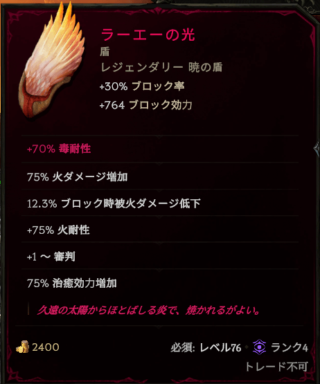 高い毒耐性がつく。ダメージやブロックに寄与するAffixを期待していたものの、耐性も決して無駄にはなりません。例えば、アイドルで耐性を稼がなくてもよくなり、結果としてダメージにも貢献するからです。