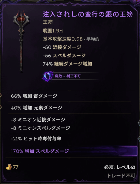 Fire DoTに噛み合ういくつかのユニークと、道中で拾ったイグゾルトやレアの良品で強化モノリス到達までは問題なく進めました。特に必須ユニークみたいなものはなく、仮に全身イグゾルトでも問題なく機能するはずです。