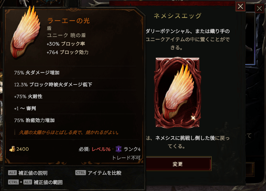 ただLPなしの状態だったので、ネメシスの卵に入れてみました。ハズレAffixがついても別に害はないので、やり得です。そう考えると、シーズン4のコラプト化はこれまでになくハイリスクなクラフトなんだなと実感。
