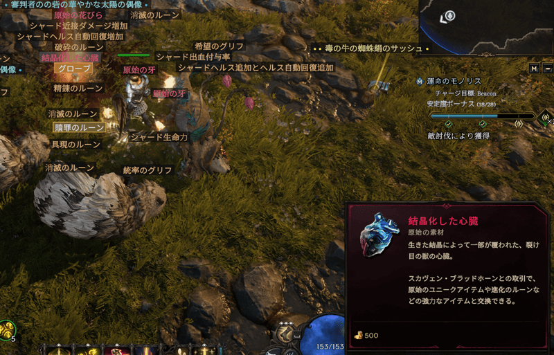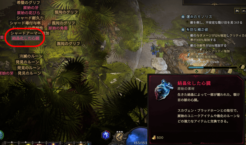 Primordial固有のアミュレットの交換に必要な素材集めに難儀していたところ、「結晶化した心臓」が直ドロップ。