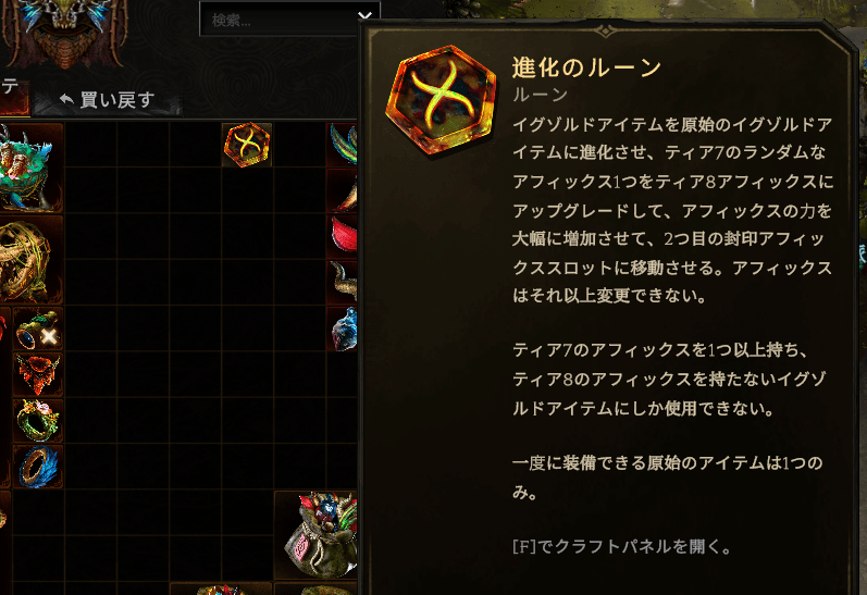 ところで、Primordialのコンテンツでは、固有ユニークだけでなく、イグゾルトアイテムに使える専用ルーンもあります。