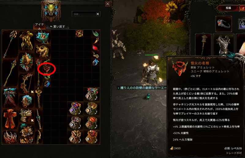 アミュレットでモブ戦でのAOEが改善されたので、ACT初期から使っていたユニークセプター「火放つ者の松明」を外しました。その代わりにシンプルにダメージが伸びそうなイグゾルトを採用。