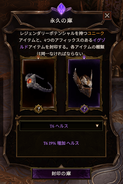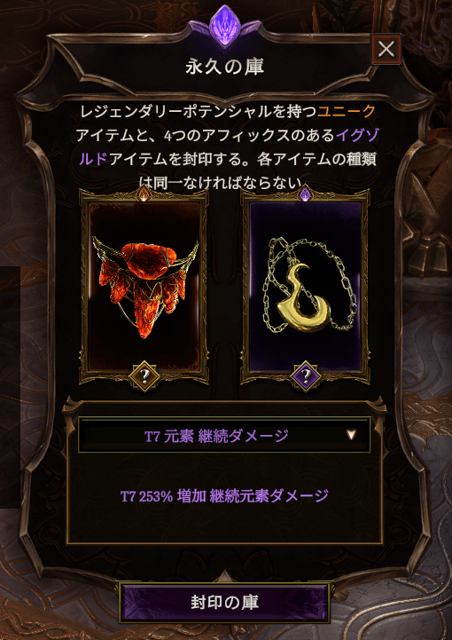早速「時の聖域」でイグゾルトと合成するために、Affix移植用のイグゾルトを用意します。Fire DoT型にとって最も有用と思われるT7 継続元素ダメージのアミュレットを運良く拾っていたので、これを使います。