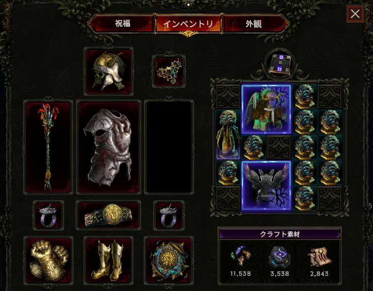 アミュレット:Aberroth撃破時点では有り合わせの「消された者たちの遺産」を使っていました。何でコレ?って感じで正直最適解からは程遠い品なので、他にもっといい選択肢があると思います。