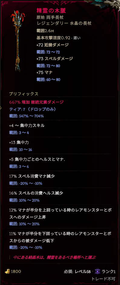 ベースが両手長杖なのも重要です。このベースには最大で700%近い「継続元素ダメージ増加」がつきます。つまり、精霊の木脈には合成によってそのAffixを付けられるということ。このAffixがあるのとないのとでダメージは大きく変わります。
