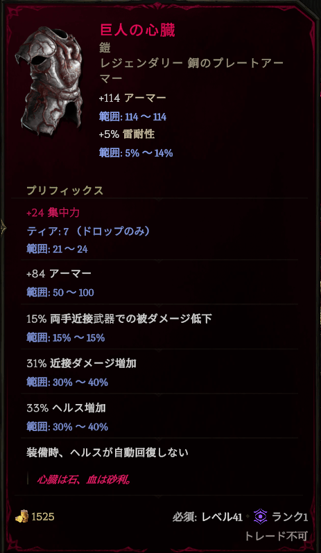 武器が両手型なので、胴体は『巨人の心臓』が使えます。ヘルスの自動回復がなくなりますが、オーラ化した聖なる大地や仇討ちで回復できるので、実質デメリットを踏み倒せます。手に入れやすい点も有用です。