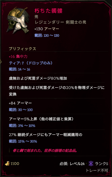 ヘルメットはこのビルドに明確なシナジーを持つユニークがないため、割と自由枠という位置づけです。『朽ちた髑髏』は手に入れやすく、防御面を強化してくれます。正直、通常Aberrothを倒すところまでならそんなに重要ではないと思います。