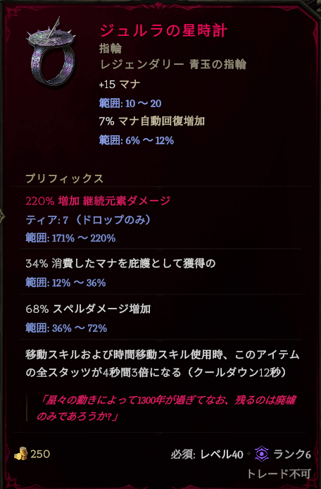 指輪の「継続元素ダメージ増加」のAffixは最大値で220%という大きな値がつくので、これを付与します。紛らわしいのですが「継続ダメージ増加」のような他のAffixだと極端に値が小さくなるので注意。12秒に4秒だけですが、660% Incの効果を得られるわけで、他の指輪でこんなに瞬間火力が出る選択肢はないと思います。