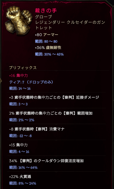 合成するAffixは悩ましいところですが、やっぱり火力を優先した方が結果的に死ににくくなると思います。審判を強化する集中力は胴体で最大24もらえるので大きいです。最大マナが増えると火力も増える仕組みがあるので、%最大マナ増加もアリかもしれません。シンプルに継続ダメージを増やすAffixも選択肢に入ります。