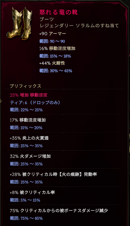 火ダメージ増加はおまけって感じで、被クリティカルダメージを減らすのがメイン。クリティカルを受ける確率が上がる代わりに、そのダメージボーナスをこのブーツだけで大きく減らせます。
