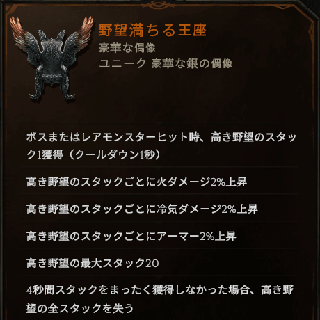 「野望満ちる王座」を使うと、実質20% moreのダメージUPとなります。何でもいいのでヒットを与え続けるとこの偶像独自のスタックが溜まり、ダメージやアーマーが増えるという仕組み。