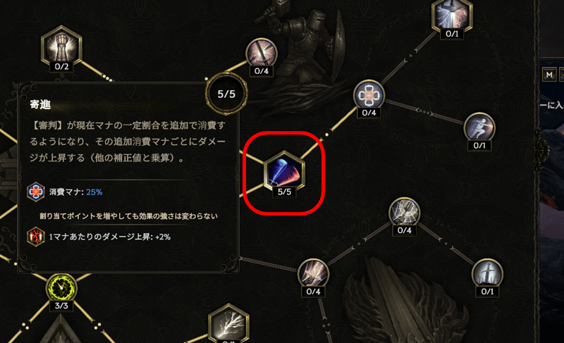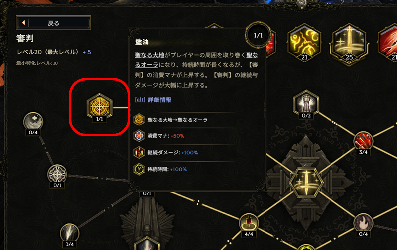 重要な点として、このビルドは審判が作り出す聖なる大地の火属性のDoTダメージがメインのダメージソースになります。よってMeleeやHitのダメージを伸ばしても意味はありません(最初の一撃のダメージが上がるだけ)。前述の塗油ノードはダメージ上昇の数値なども考慮すると、DoTダメージを伸ばす方向性なら(ゲームデザイン的に)取らない理由がないと思います。