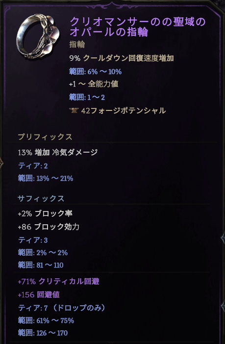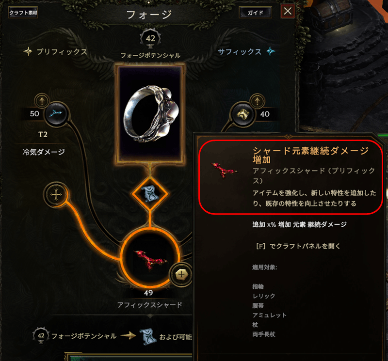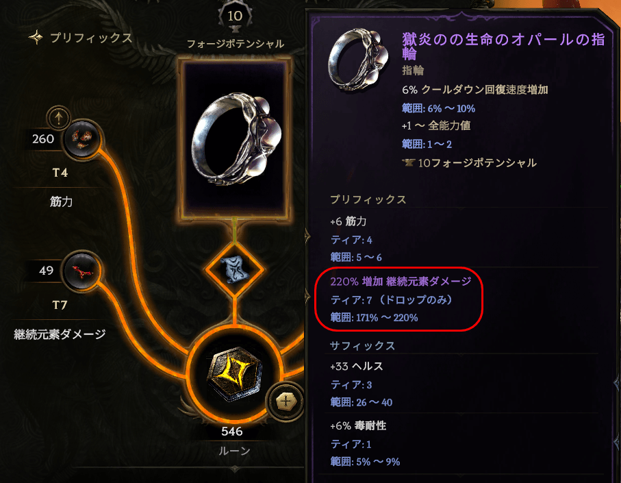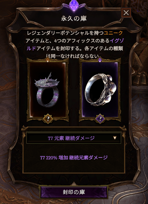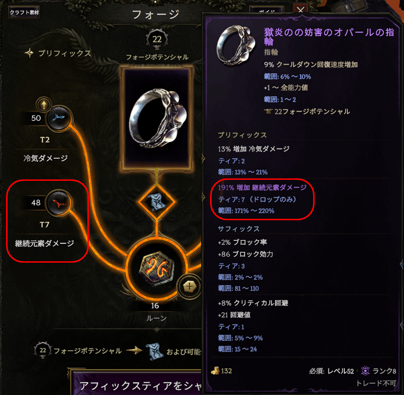 まず、何でもいいので封印されていないT7 Affixを1つ以上持つイグゾルトの指輪を用意します。T6ではいけません。フォージポテンシャル(FP)はなるべく高いものがいいです。T7のAffixは何でもよいため、こういったアイテムの入手自体は容易なはずです。