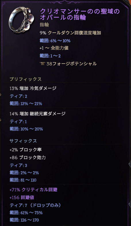 目当てのT7 Affixを手に入れるだけなら話はここで終わりです。しかし、このままではロール値があまり良くありません。長く使う予定の装備のためなら、ロール値の吟味もしたいところです。