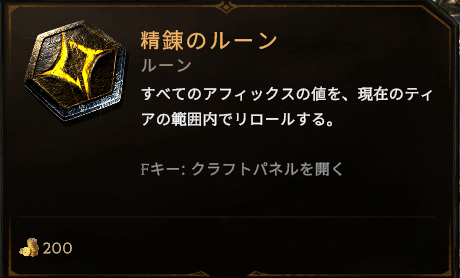 そんなに重要なことではありませんが、目当てのAffixが希少なAffixである場合、破砕のルーンでそのAffixのシャードを用意しておく方がいいかもしれません。空き枠に追加する時に1つは使うからです。まあ、そのシャードを1つも持っていないなんてことの方が珍しいかもしれないので、一応って話で。