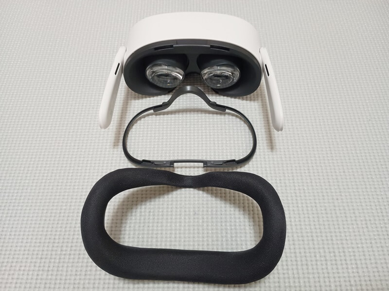 Meta Quest 3S本体の方は初期ストラップと接眼部を外しておきます。個人的にストラップを外すとき、アームが折れそうでけっこう怖いです。